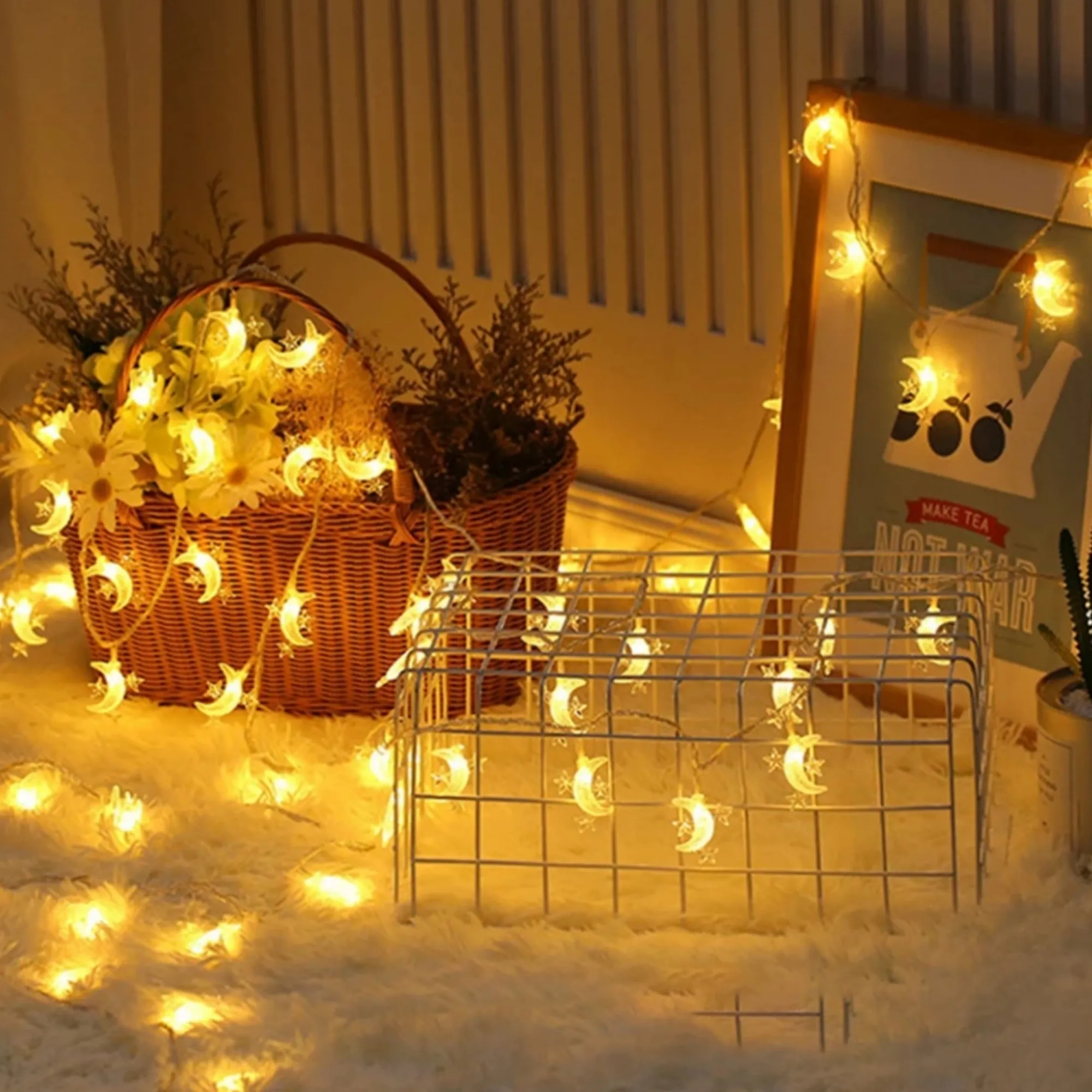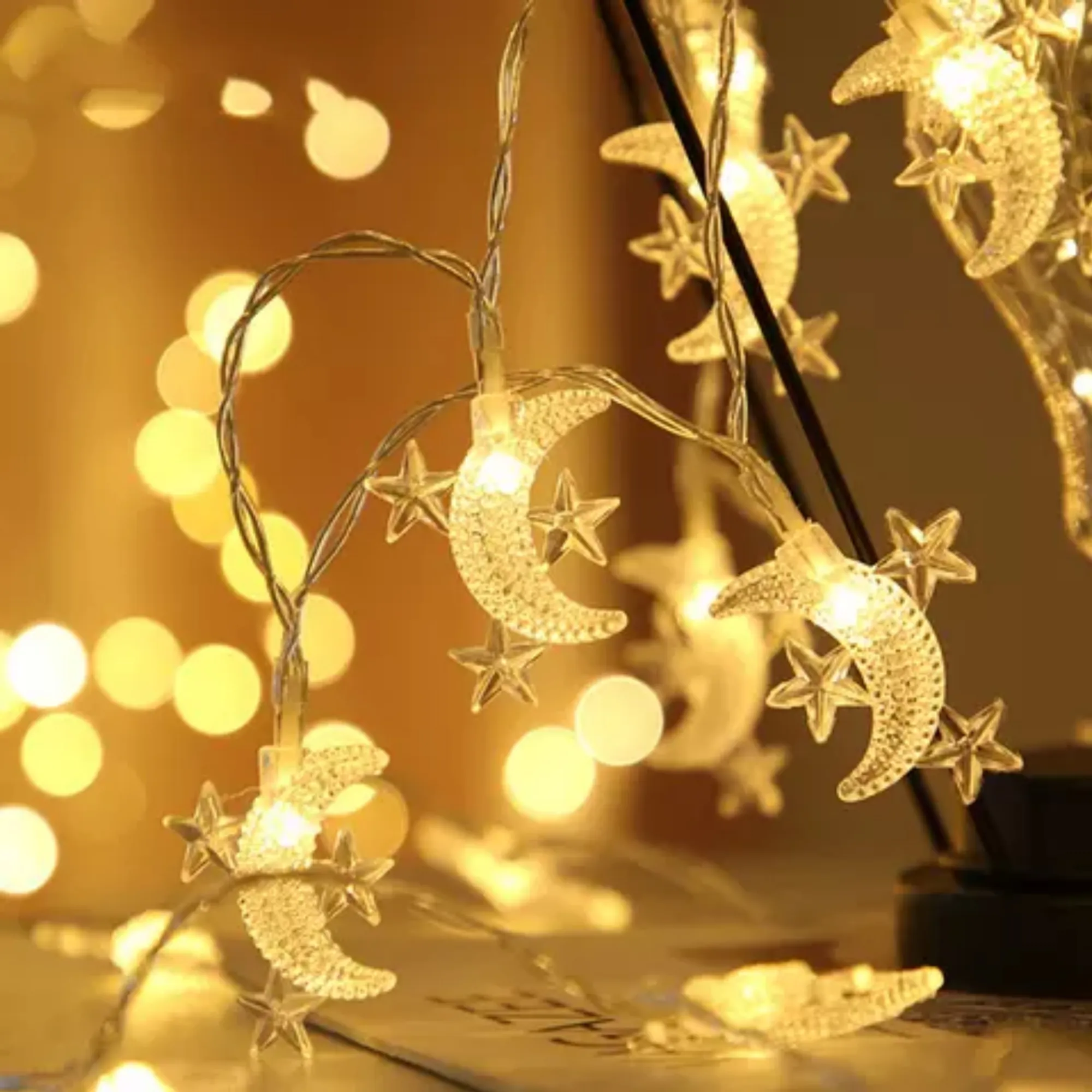 Unique decorative LED string light with 20 Moon Star LED, elegant design, and improved atmosphere to your place. Made of high quality ABS and silver wire, it is durable, it is beautiful when lights are on.